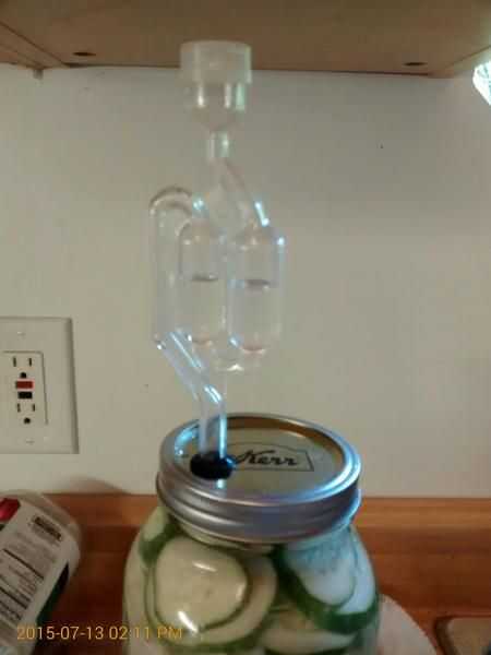 Añadir el conjunto de cerradura y tapa de fermentación. Asegúrese de que el tubo de bloqueo de la fermentación es encima del nivel de salmuera por lo que pueden salir gases. Llene el bloqueo de la fermentación la mitad con agua en ambos lados.