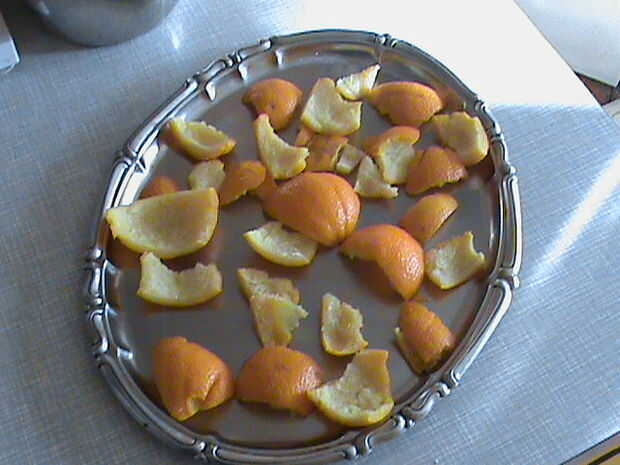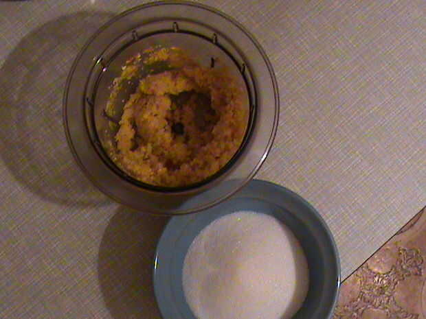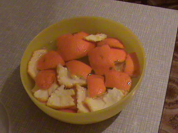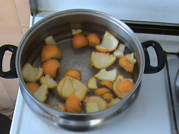 Poner cáscara de naranja en agua fría y dejar para reposar 24 horas en él. Al día siguiente ponerlos en agua limpia y cocine hasta que estén suaves. Retire del agua y secar 10 horas Después de eso, molerlos en una máquina para la carne o en una licuadora.
