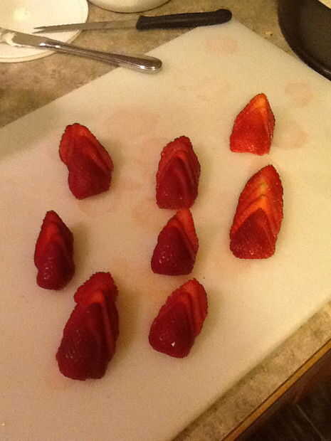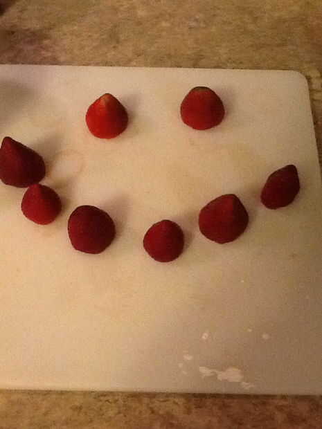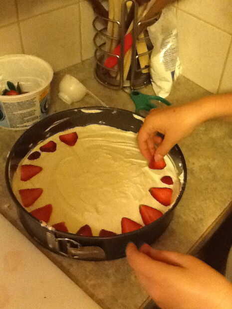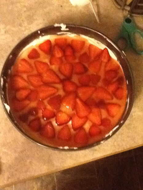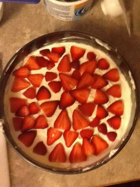 Después de que su tarta de queso es refrigerado, apartar, picar sus 8 fresas grandes y mezclar en un bol con 5 cucharadas de mermelada de fresa. Vierta la mezcla de fresas en la parte superior. Luego disfrutar!!!!!!