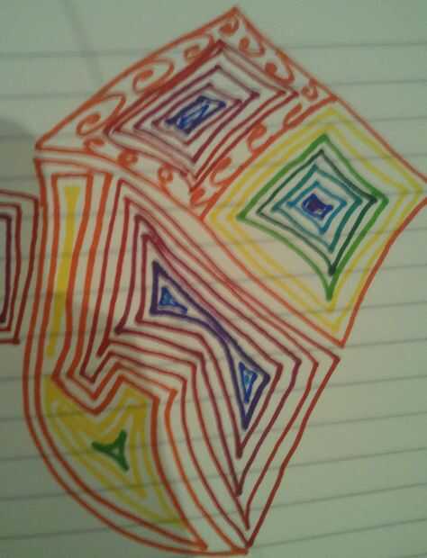 Una mejor idea me llamó la atención puesto que los colores eran un espectro completo podría color cada línea por separado y paso hacia arriba o hacia abajo el arco iris para los vecinos de colores. Da vuelta hacia fuera, esto es una manera fácil y eficaz para obtener un patrón constante sin tener que esbozar la cosa entera hacia fuera.