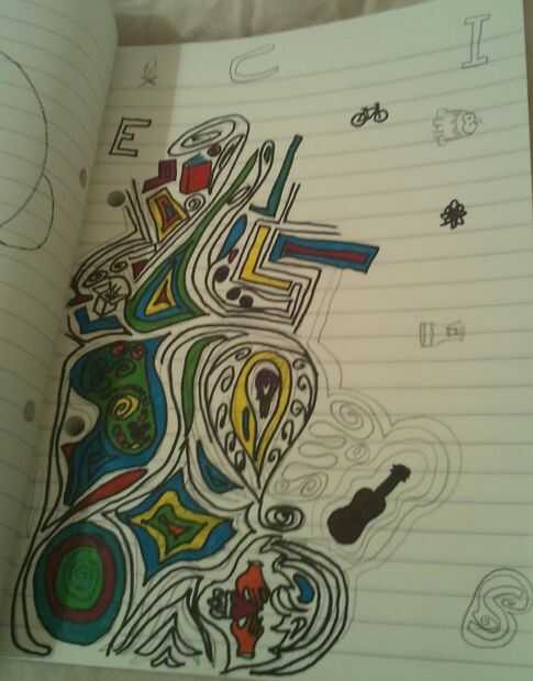 Comenzar dibujando los símbolos y esbozar un diseño abstracto a su alrededor con lápiz, sobre sus líneas con un rotulador. Originalmente pensé que podría llenarte en las áreas con sólido color (primera foto), pero que el diseño bastante pesado y oscuro, y también un poco estaba limitado por el tiempo.