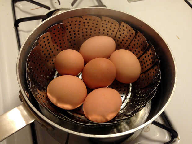 Realmente me gusta mi huevos de vapor. Ponerlos en una vaporera sobre agua hirviendo con la parte superior en de 8 a 9 minutos. Cuando el tiempo está para arriba, la cuchara les cuidadosamente uno por uno en un recipiente y llenar con agua fría, para bajar la temperatura.