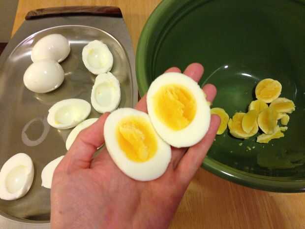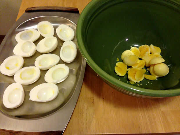 Con un cuchillo afilado, cortar longitudinalmente cada huevo. Entonces pop la yema de cada huevo la mitad con el dedo. Debe salir como un trozo sólido, pero usted puede necesitar doblar muy ligeramente la clara de huevo para obtener la yema de huevo para sacar. Tenga cuidado de no rasgar alguna de las claras de huevo, a veces puede ser muy delicados.