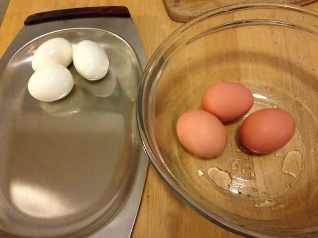 Vierta el agua en el tazón de fuente de huevos y cáscara de cada huevo. Me gusta el método de peeling que se fracture el huevo en el borde de un tazón de fuente y luego rodar sobre una superficie plana. A menudo esto hace muy fácil de pelar, y la cáscara sale en forma de espiral.