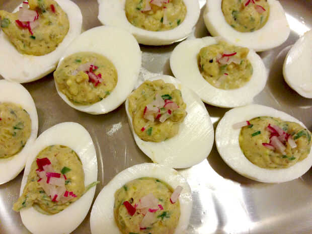 Una vez que tienes todo en la bolsa, gire el extremo abierto cerrado y tubo la mezcla en cada huevo blanco la mitad. Decorar con algunos Rábanos picados en la parte superior, y listo!