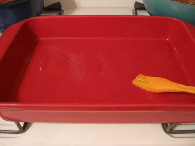 Precalentar el horno a 400 grados Fahrenheit. Unte el sartén con el aceite de oliva adicional – usted realmente sólo necesita 1 cucharada de él – incluso si dice que su pan no se pegue (a menos que encontrar divertido de fregar y fregado salsas lasaña buena fuera de su bandeja sucia en vez de moverse el tiramisú y las pizzeles recubierta de chocolate y ese helado de spumoni auténtico...).