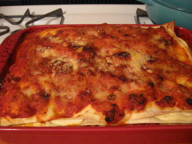 / * Definiciones de estilos * / tabla. MsoNormalTable {mso-estilo-name: "Tabla Normal"; mso-tstyle-rowband-tamaño: 0; mso-tstyle-colband-tamaño: 0; mso-estilo-noshow:yes; mso-estilo-parent: ""; mso-padding-alt: 0 en 5.4pt 0 en 5.4pt; mso-para-margen: 0; mso-para-margen-abajo: .0001pt; mso-paginación: viuda-huérfano; fuente-tamaño: 10.0pt; font-family: "Times New Roman"; mso-ansi-language: #0400; mso-fareast-language: #0400; mso-bidi-language: #0400;} Salpicar la parte superior de la lasaña con dos cucharadas de aceite de oliva. / * Definiciones de estilo * / tabla. MsoNormalTable {mso-estilo-name: "Tabla Normal"; mso-tstyle-rowband-tamaño: 0; mso-tstyle-colband-tamaño: 0; mso-estilo-noshow:yes; mso-estilo-parent: ""; mso-padding-alt: 0 en 5.4pt 0 en 5.4pt; mso-para-margen: 0; mso-para-margen-abajo: .0001pt; mso-paginación: viuda-huérfano; fuente-tamaño: 10.0pt; font-family: "Times New Roman"; mso-ansi-language: #0400; mso-fareast-language: #0400; mso-bidi-language: #0400;} Hornear en el estante central por 30-40 minutos. Cuidadosamente retire la olla del horno - sí, me refiero a necesita buen funcionamiento manoplas. Espere cinco minutos antes de cortar en 8 porciones incluso (no, no me hacen dibujar el boceto de corte para usted.) Servir con una espátula ancha resistente al calor. ¿No son esas capas una belleza?