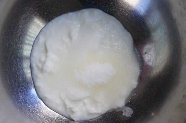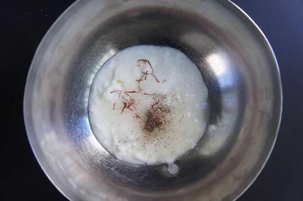 1) en un bol, añadir el yogur, azúcar, cardamomo molido, azafrán y ritmo utilizando una batidora de mano.