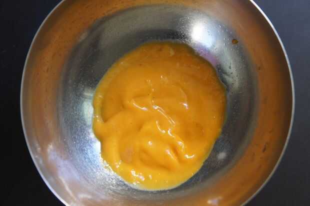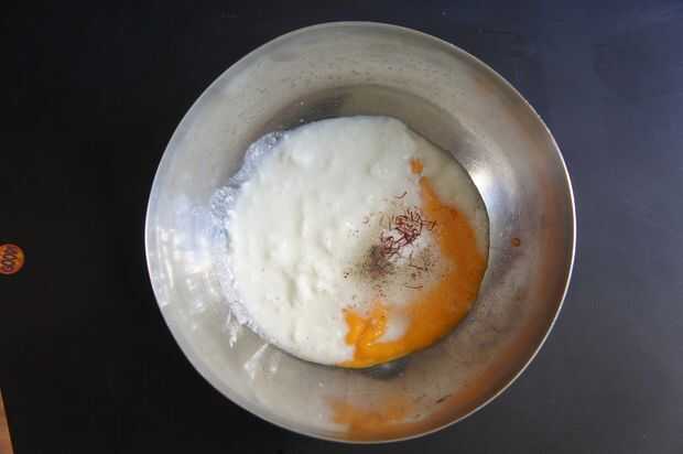 1) en un bol, añadir la pasta de mango, queda el yogurt, azúcar, cardamomo, azafrán de la tierra y batirlo con una batidora de mano.