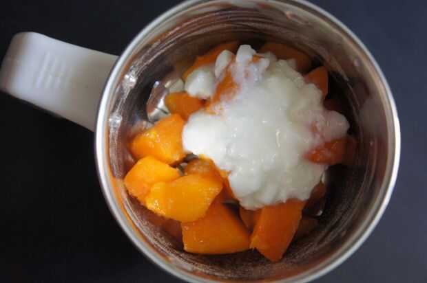 1) moler el mango picado con 2 cucharaditas de yogur en una pasta suave en una licuadora.