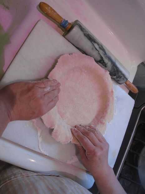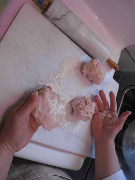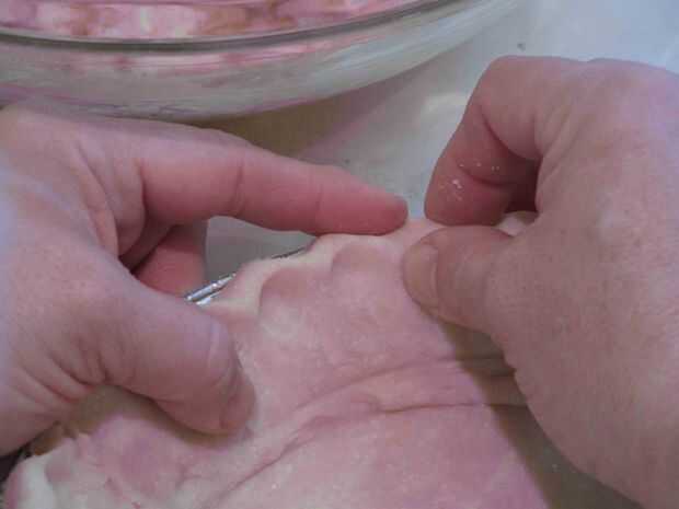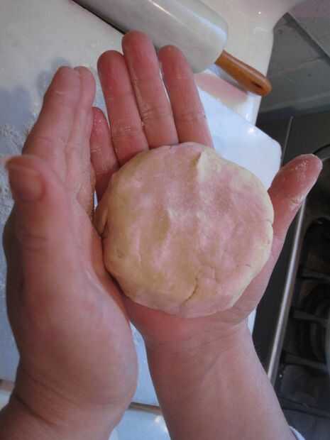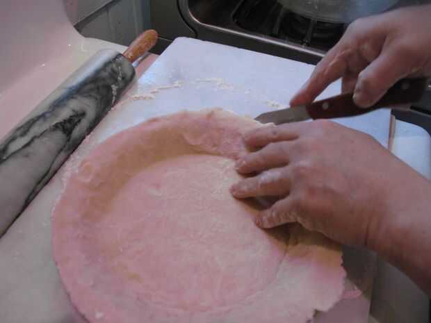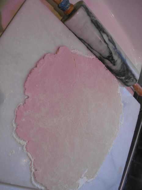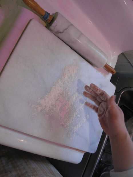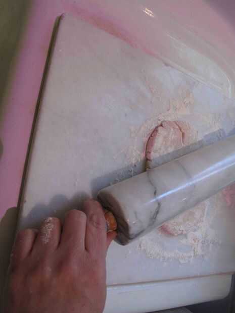 Generosamente espolvorear una superficie con harina, espolvorear la masa con harina y estirar la masa. Me gusta trabajar con un perno de balanceo de mármol y tablero de mármol, pero el truco es la cantidad justa de harina para que la masa no se pegue.