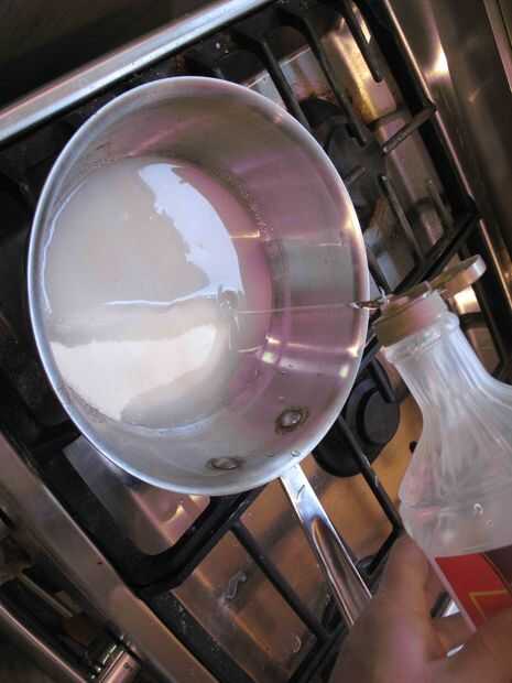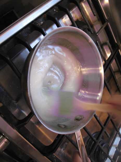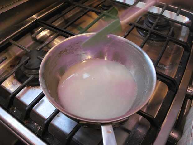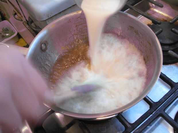 Añadir con cuidado la crema caliente a la mezcla de azúcar. Comenzará a burbujear furiosamente así que mucho cuidado.