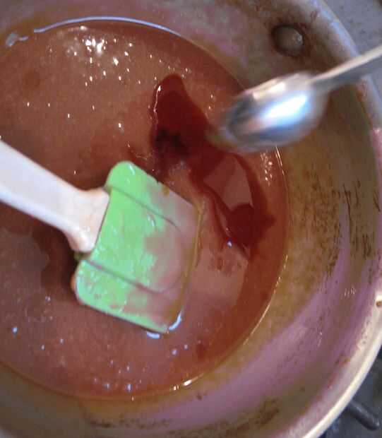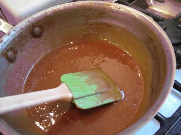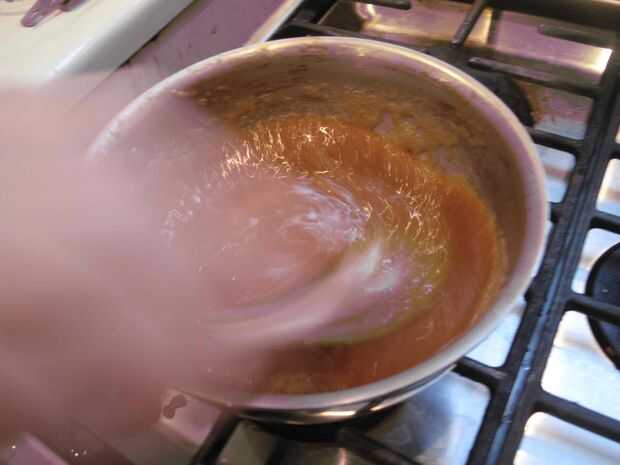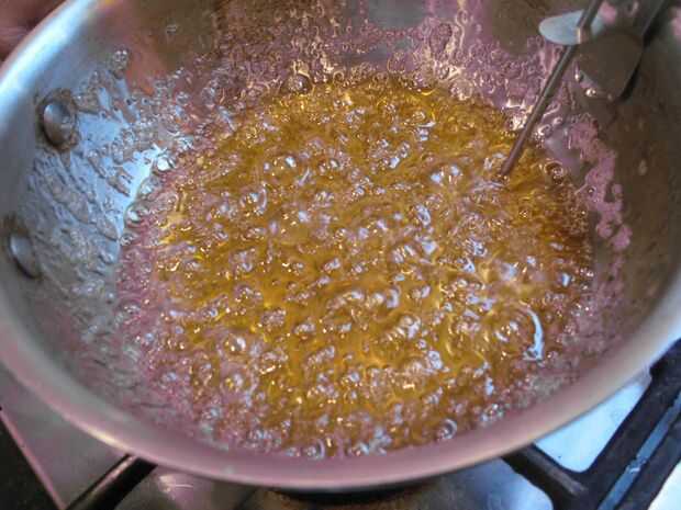 La mezcla tomará unos 5 minutos para alcanzar el rango de 320-350F (C 160-176). Observan de un color ámbar profundo, que aparece alrededor de 340F (171C). Retire del fuego.