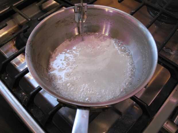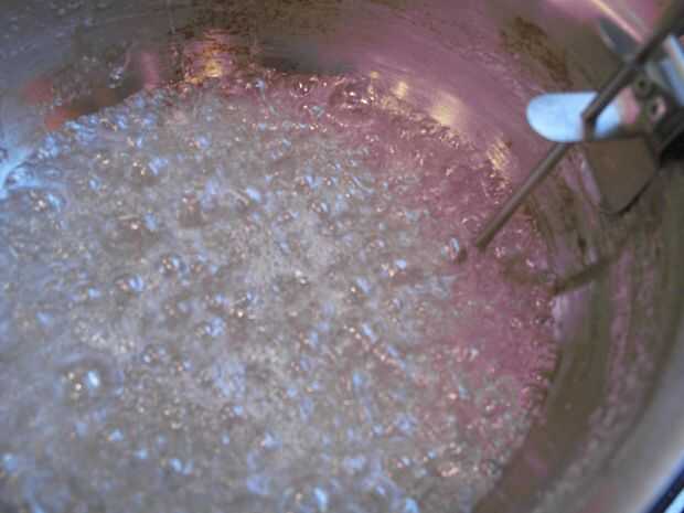 Cuando la mezcla llegue a hervir, entregar! Dejar de revolver. Si tienes un termómetro de caramelo, se puede utilizar ahora.