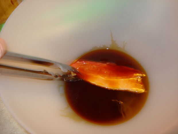 Dunk en primer lugar, cada losa de tocino a la salsa teriyaki para cubrir ambos lados.   Cubrir bien de muy buen sabor.