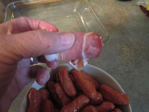 Corte el paquete de Little Smokies. Envolver un trozo de bacon alrededor de cada pequeña Smokie,