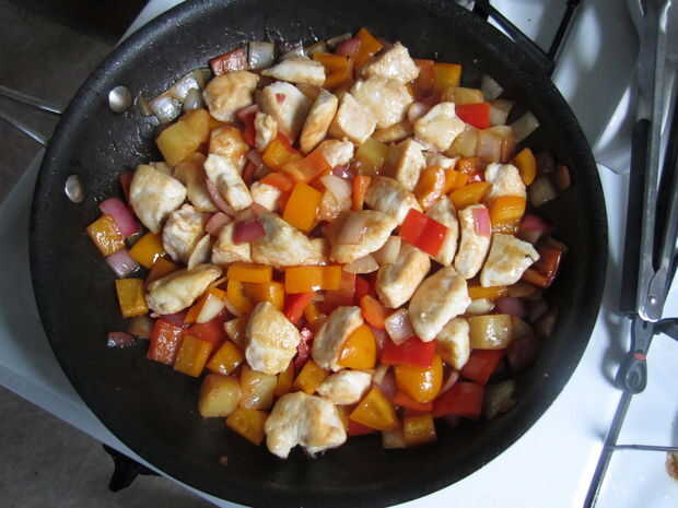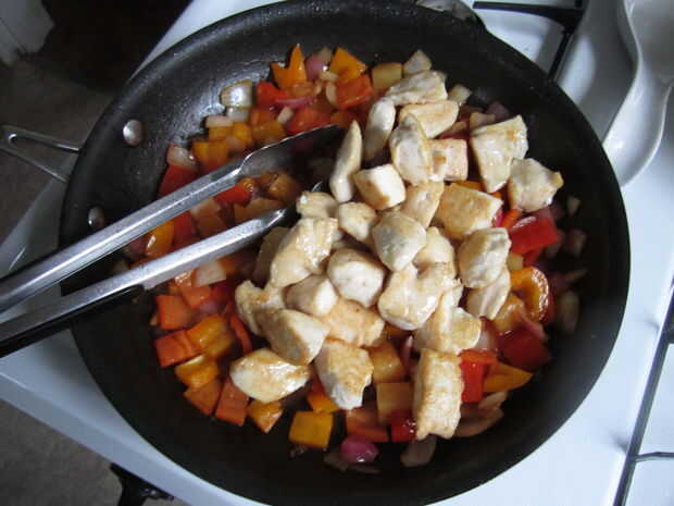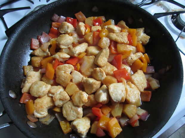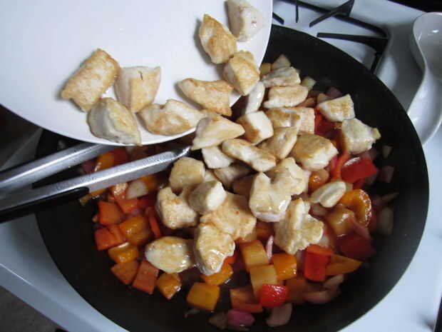 Mezclar todo junto y a fuego lento, revolviendo de vez en cuando durante 5-10 minutos, hasta que el pollo está hecho.