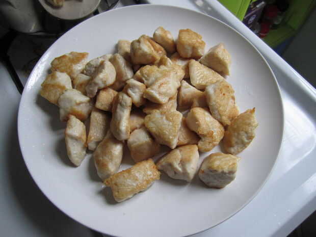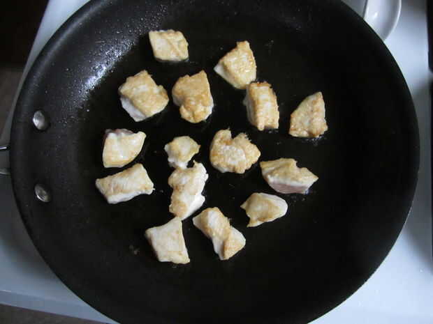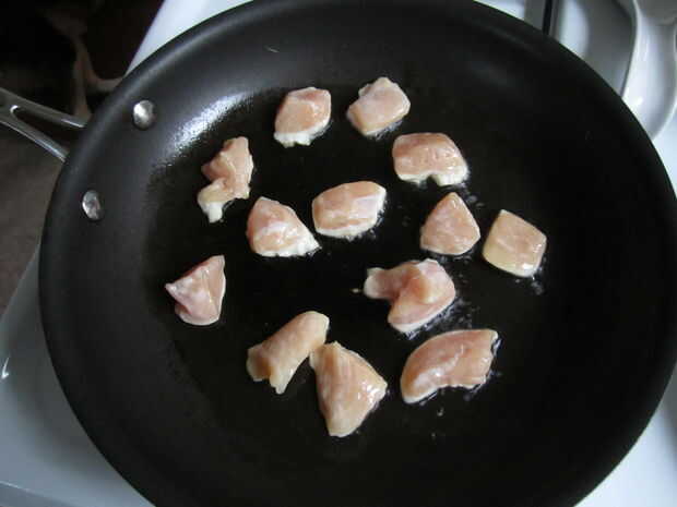 Añadir los trozos de pollo recubiertos, asegurándose de no masificar la sartén y cocemos un minuto por cada lado, para que estén ligeramente doradas. Probablemente necesitarás hacerlo en dos o tres tandas, a menos que tengas una olla gigantesca. El pollo estará rosado en el centro - a terminar cuando hierve a fuego lento en la salsa de cocción.