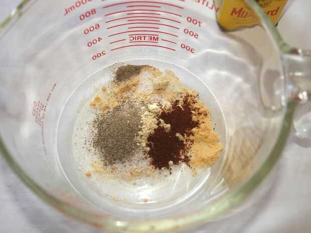 Así debe ser la sal, pimienta, ajo, mostaza seca, jengibre y clavo todos junto. Una nota sobre los dientes, es una especia muy fuerte y si tu no a locos sobre como un sabor quizá quieras cortarlo un poco.