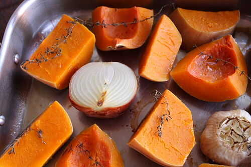 Trocear la cebolla, mezcle aceite de oliva y tiro sobre la bandeja con la calabaza.