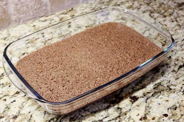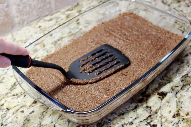 3. Ponga la corteza en un rectangular de vidrio pyrex para hornear (el mío es de 8 x 11 pulgadas). Use una espátula para halagar luego corteza hacia fuera tanto como sea posible. Hornear durante 10 minutos.