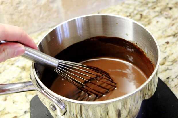 4. mientras que la corteza está horneando, calentar la crema de leche en una cacerola pequeña a fuego medio hasta que esté muy caliente pero no donde cerca de ebullición. Remover con mucha frecuencia para evitar que se queme. Añadir la mantequilla y la sal. Cuando la mantequilla se haya derretido, retirar la sartén del fuego y vierta los chips de chocolate. Utilice un batidor revolver vigorosamente (aprox. 1 minuto) hasta que el chocolate se haya derretido. Dejar reposar hasta que la corteza.