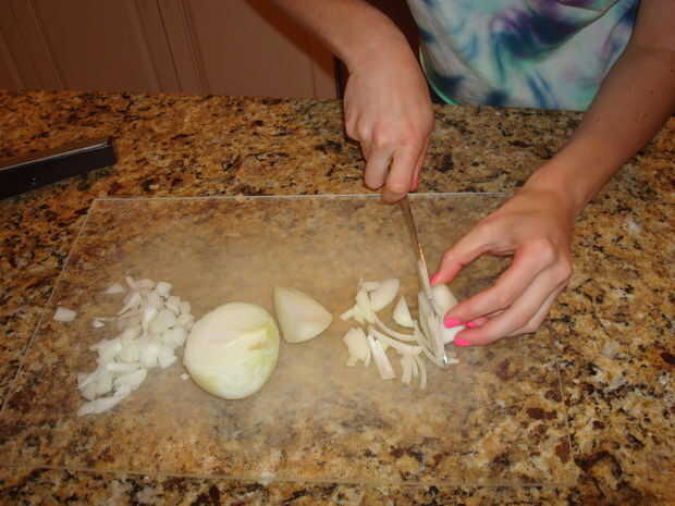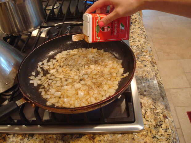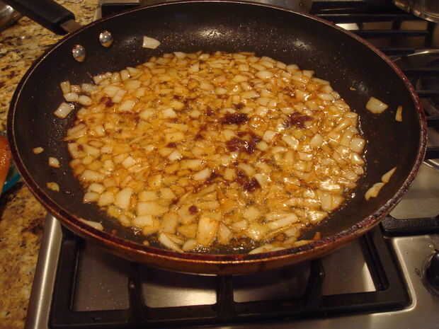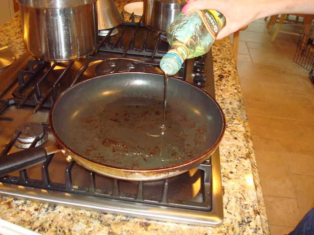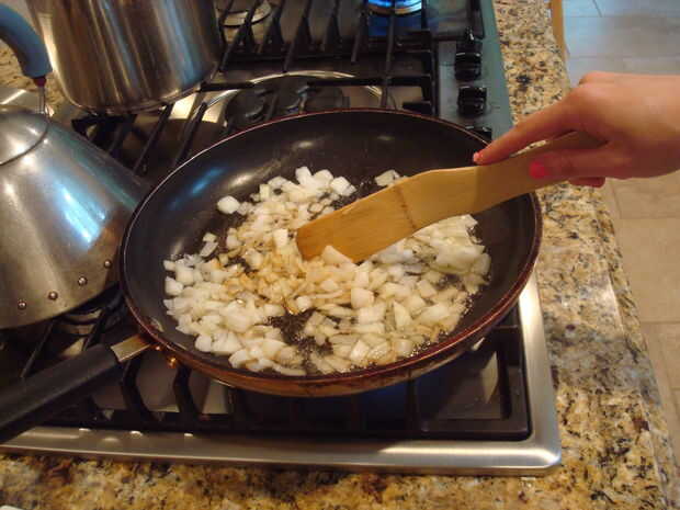Poner el aceite de oliva en una sartén antiadherente sobre la estufa y la temperatura a fuego medio. Una vez que calienta la olla agregar las cebollas. Use una cuchara de madera revolver la cebolla para que se cubren en aceite.