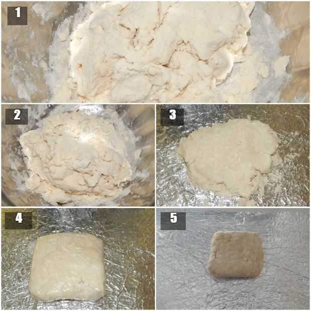 Se reúnen mezcla en la superficie de trabajo y forma un cuadrado de 5 pulgadas. La masa estará abultada. Envolver con papel plástico y refrigere durante 30 minutos.