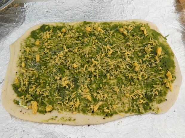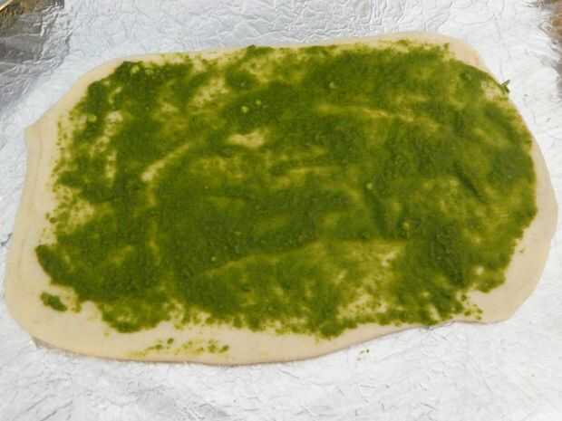 4. Extienda la pasta de albahaca uniformemente sobre la masa. Agregue pimienta negra molida y queso sobre la masa.