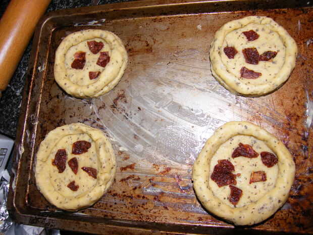 Este tiempo sin embargo añadir unos tomates secos picados a la parte superior de las galletas pizza.