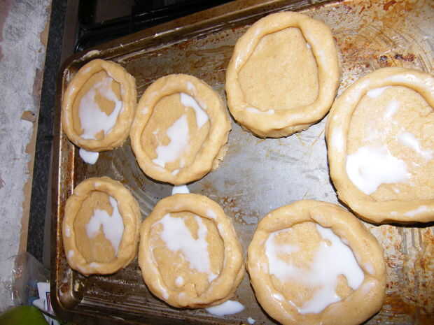 Conseguir su izquierda sobre masa para galletas y freno arrancar pequeños trocitos. Rodarlos en serpiente formas y ponerlas en sus bases de pizza para crear pequeñas cortezas de pizza. Luego una capa ligera de las cookies de tu pizza con leche o con huevo para darles cierta fuerza y brillo.