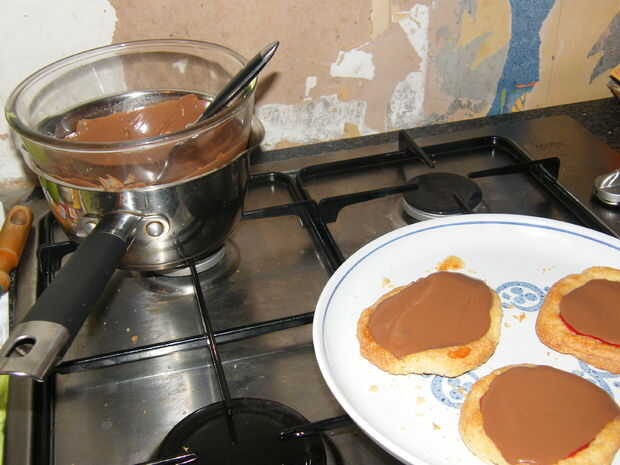 Luego llevar las cookies a la estufa y cuidadosamente la cuchara el chocolate derretido sobre las galletas, habrá derrames y funciona y te va comer el chocolate, su irresitable. Luego poner las galletas en la nevera durante unos minutos permitir que el chocolate configurar disco duro.
