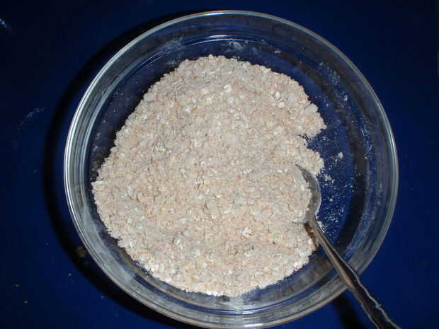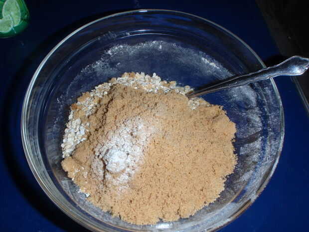 Cierna la harina, la sal y el bicarbonato de sodio; Mezcle el azúcar moreno y la avena.