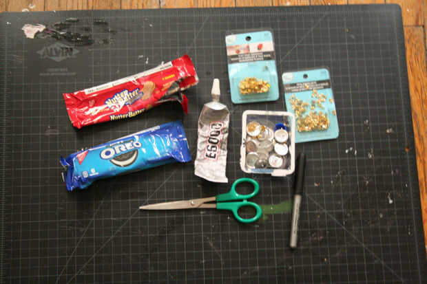 • caramelo / envolturas de alimentos (estoy usando envolturas de un paquete de mantequilla de Nutter y Oreos)