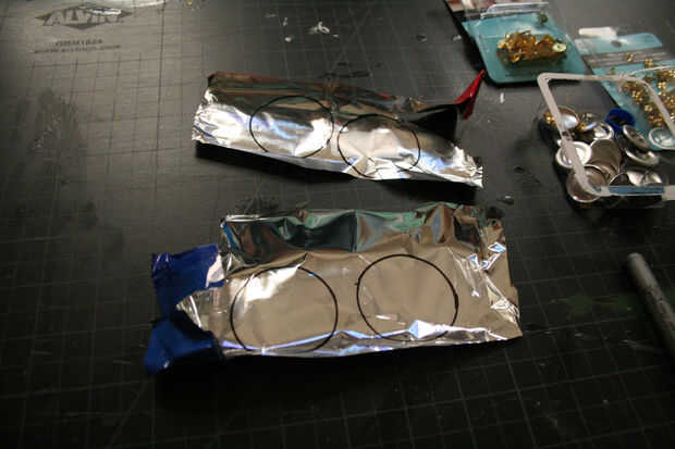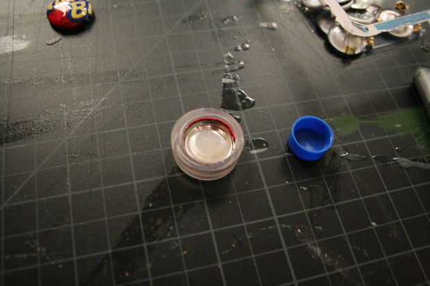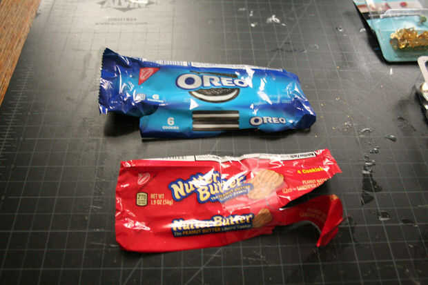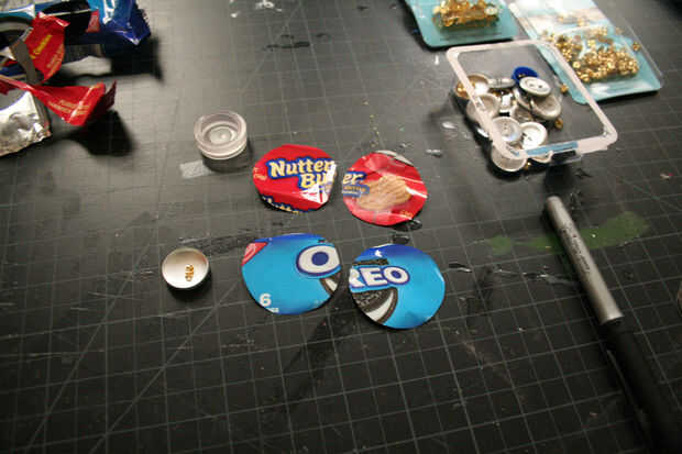 En primer lugar, colocar una envoltura de caramelo en su espacio de trabajo y usar un lápiz o bolígrafo para trazar un círculo alrededor de la plantilla de plástico incluida en el kit de cubierta de naves. Recorte los círculos y colóquelos en el molde con un botón de la cubierta.