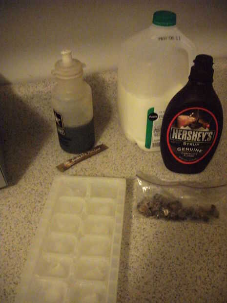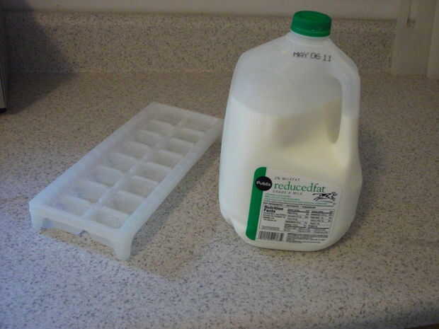 Tomar 3/4 tazas de la leche y ponerlo en una bandeja de cubos de hielo. Congelar durante la noche.