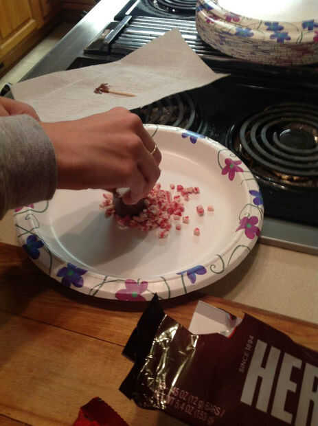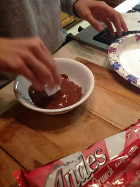 Tomar su marsh mellows y baño en el chocolate hasta la mitad de lo marsh mellow está cubierto Conjunto la marsh mellows en un plato a enfriar. Tomar los pedacitos de hierbabuena y algunas vaciar en un plato. Una vez hecho esto, el rodillo la parte cubierta chocolate del pantano suave en los pedacitos de hierbabuena