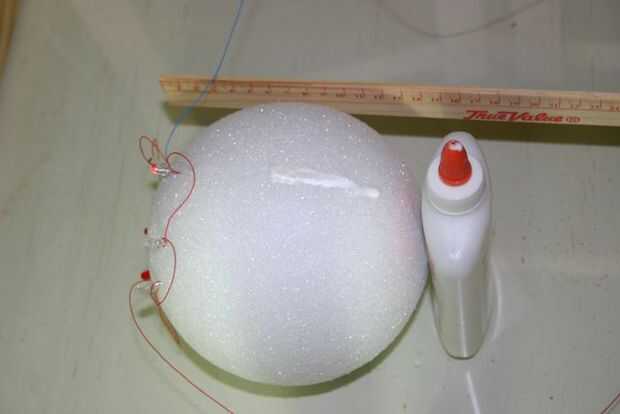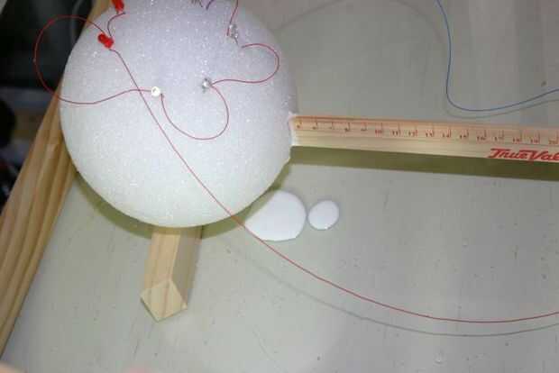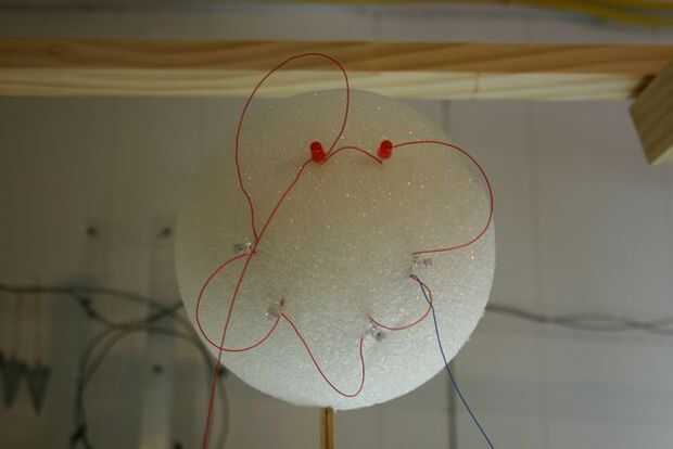 Soldar el LED entre sí (como se muestra en el esquema), a continuación, insértelos en una bola de espuma de diámetro de 6". Empuje el extremo de una vara en la bola como un "cuello". Pegamento (cola blanca) el palo a la bola de espuma. Usé el cuello madera incluso cuando cambié a una columna de aluminio--no estaba seguro de cómo pegar el aluminio a la espuma.