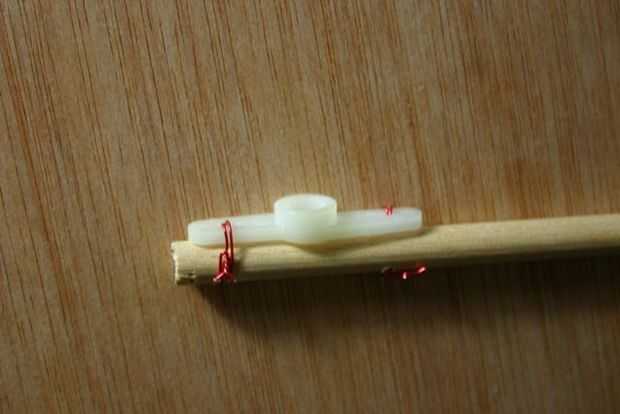 Toma un pedazo largo de 7 pulgadas de 1/4 varilla de madera y alambre para el cuerno del servo motor.