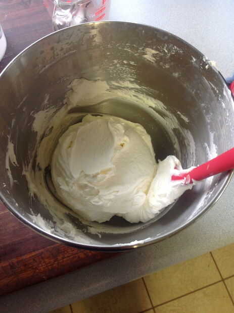- Con mixer se encuentra en funcionamiento, vierta la crema fría y la vainilla en la mezcla y batir durante 3 minutos hasta que el glaseado empiece a espesar ligeramente. Colores y sabores se pueden añadir en este punto o puede dividir la mezcla y hacer una variedad de colores.
