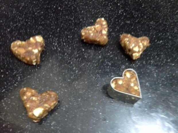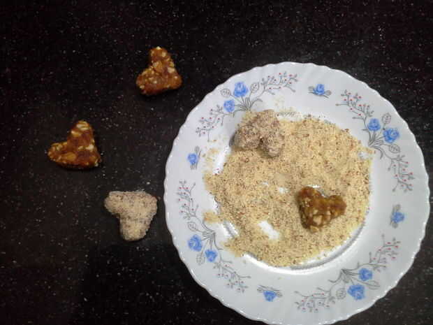 Puesto que la masa es muy pegajosa no toma mucho esfuerzo para cubrir estas mordeduras y las cookies con el anacardo fino + partículas de almendra (cuadro 2).