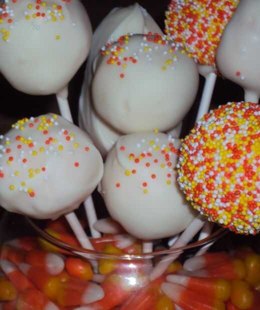 Cake pops son mucho más fáciles en las fiestas de magdalenas. No helar pegajoso en las manos y no hay pastel cubren envolturas poniendo todo sobre el lugar. Estos son colores de maíz de caramelo funky! (parece ser mi tema de este año)