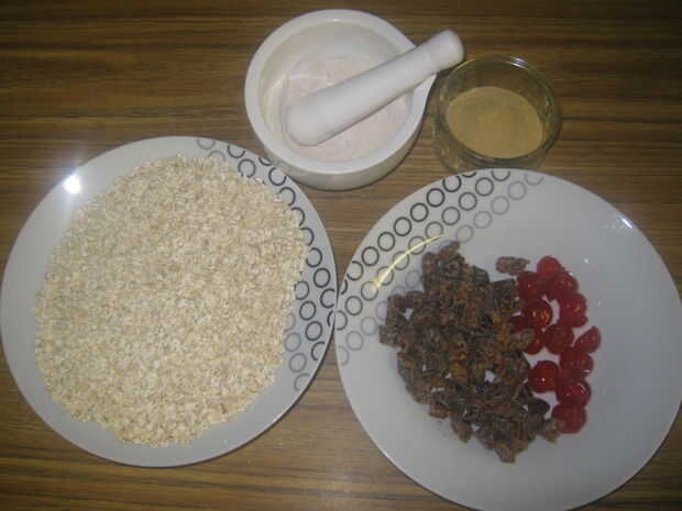 Moler el clavo de olor y las semillas de cardamomo con parte del azúcar, mezclar bien con la avena.