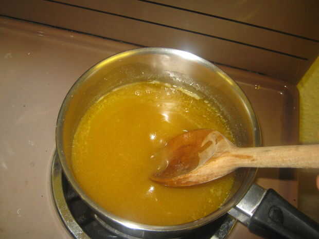 A fuego lento, derretir la mantequilla, el azúcar y la miel en una cacerola pequeña.