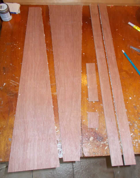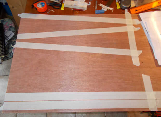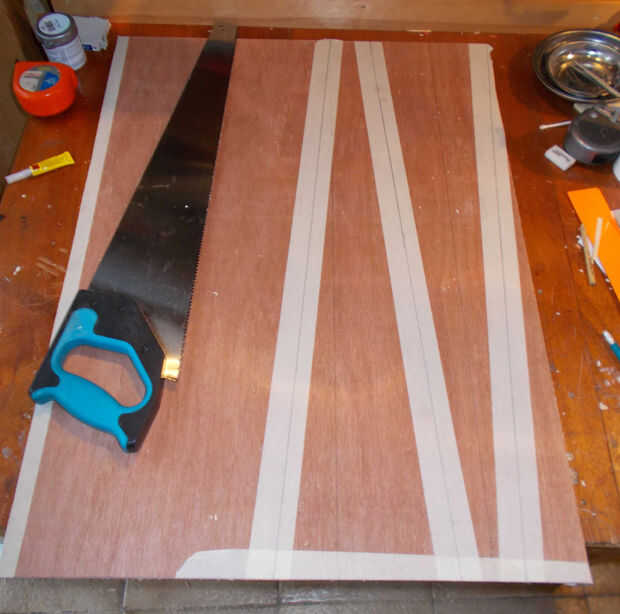 Corte la madera a las dimensiones correctas, cubriendo los cortes con cinta adhesiva para reducir la fragmentación. Usé una sierra de mano porque creo que puedo cortar recto con eso que un rompecabezas.