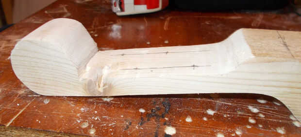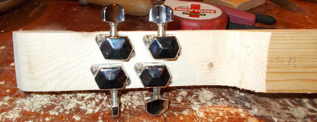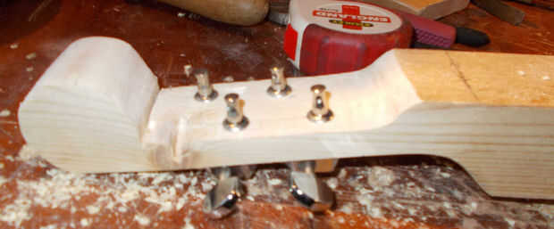 Por desgracia para mí era un nudo de madera muy resistente en el borde de mi cabezal - falta de planificación por mi parte adelante. Hice lo que pude con él, pero apareció un pedazo de él. Me aseguré que evitar que al perforar los agujeros para los sintonizadores.