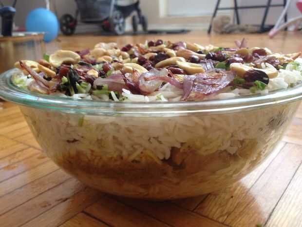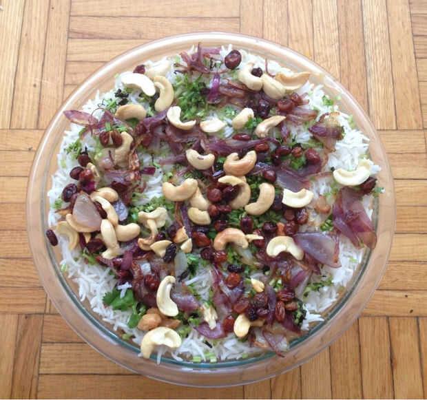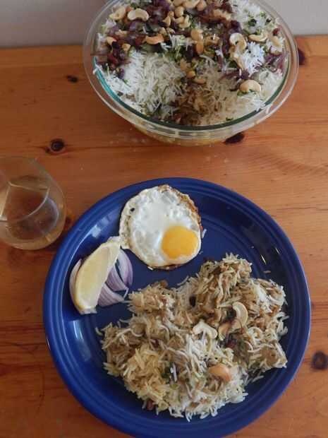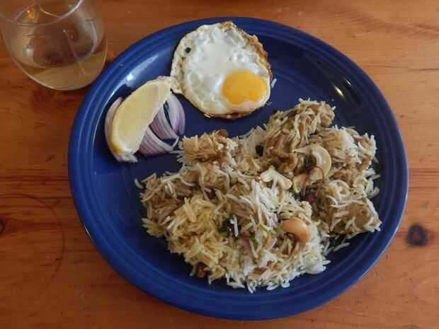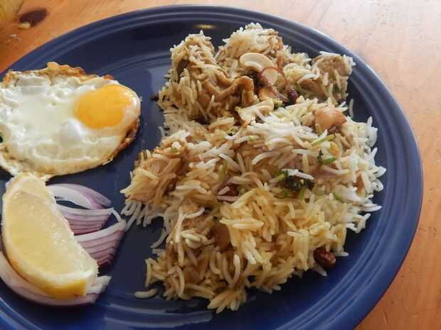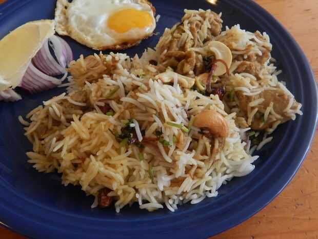 Dum biryani viene en una capa de arroz, salsa/masala de pollo, menta y cilantro hojas, cebolla frita, anacardos fritos y pasas y un chorrito de leche de azafrán o colorante alimentario amarillo. El sabor del biryani es rico y tiene un sabor tan grande también... Mi familia gusta mucho. Pls, pruébalo, te va a encantar...