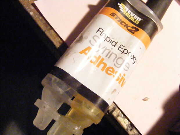 proper glue. mezclarlo para arriba algunos goop final de epoxy por el agujero, no necesita llenar lo suficiente como para tener unos 5mm o hasta ahí, la diferencia sustancia de relleno hará aquí pero no recomendaría manjar blanco.
