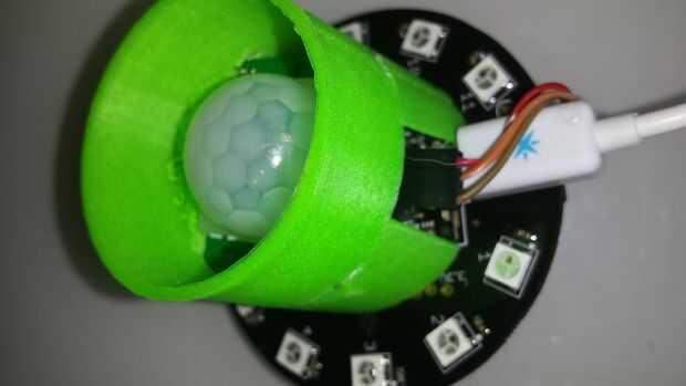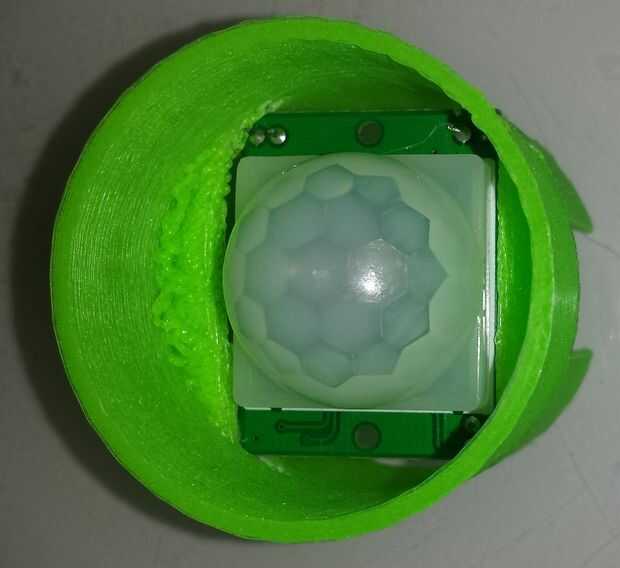 3D imprimí un montaje para el sensor de PIR y que todo el conjunto al ras en el cristal. Puede descargar los archivos STL su auto de https://github.com/funwithbots/Projects/tree/maste...