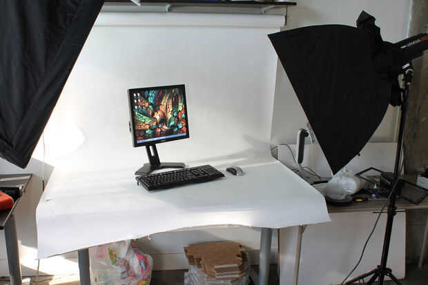 para mi negocio en casa (usbtypewriter.com) que hago mucha fotografía de producto mostrando personalizado computadoras. Pero establecer una estación de trabajo de equipo para una sesión de fotos implica un montón de instalación (ya que tengo que pasar la estación de trabajo entero de mi escritorio actual al conjunto de la foto) y el ordenador distrayendo feo cableado siempre llena hasta mis fotos de todos modos. Así que decidí crear a un monitor de computadora simulado, que se ilumina como si fueron conectado a un ordenador, pero por arte de magia no tiene ningún cableado conectado a él en todo.
